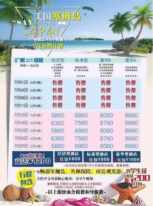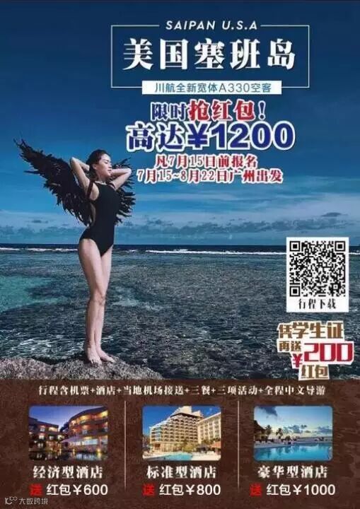 2、学生报名参加暑期广州航班塞班游,可凭本人学生证享受减免200元/位的优惠;