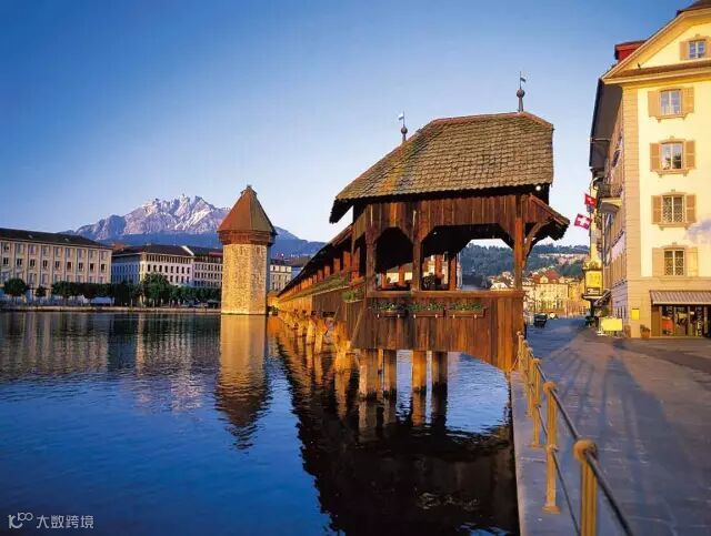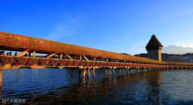 称教堂桥,花桥,于14世纪初建造的带屋檐的木质桥,中间有八角形的水塔,是琉森的标志性建筑。