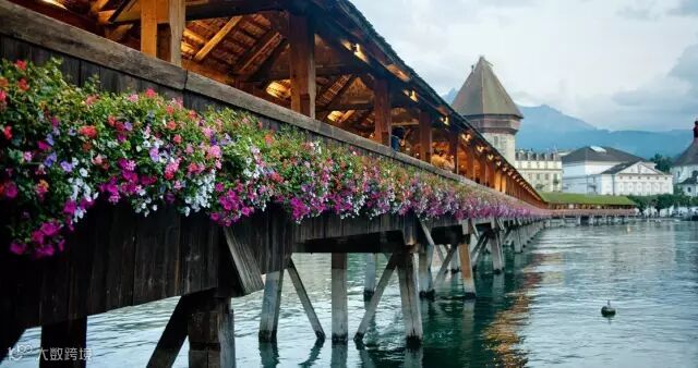 称教堂桥,花桥,于14世纪初建造的带屋檐的木质桥,中间有八角形的水塔,是琉森的标志性建筑。