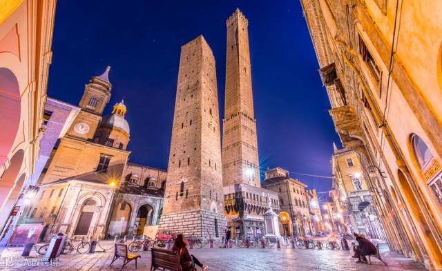 顾名思义由两座塔组成,比较高的一座名叫“Torredegli Asinelli”,而旁边较低且倾斜犹如醉汉的是“Torre Garisenda”。两座塔都建于公元11世纪,至今坚挺。Asinelli塔则屹立至今,是意大利现存第三高的塔形建筑。