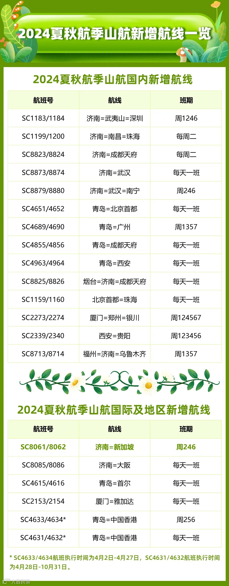 3 月 31 日起,民航夏秋航季即将盛大起航,国际及地区航线方面,除新开的济南✈新加坡,山航针对青岛✈首尔、厦门✈雅加达✈青岛✈中国香港等航线进行增班,以满足公众出行需要。
