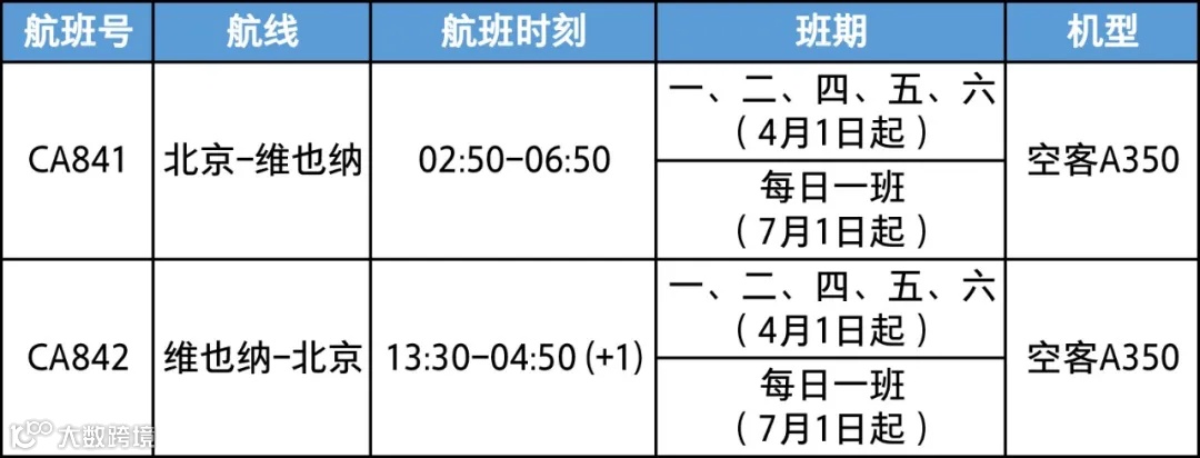 2024 年 4 月 1 日起,国航北京首都-维也纳航线将增加至每周 5 班,航班号为 CA841/2,由空客 A350 执飞。自 2024 年 7 月 1 日起,更将增至每日一班,为您出行提供更多选择。
