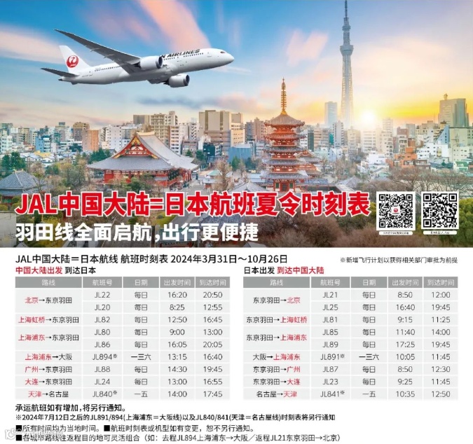 全日空中国大陆航线夏季时刻表,2024 年 3 月 31 日(含)起至 2024 年 10 月 26 日(含)。
