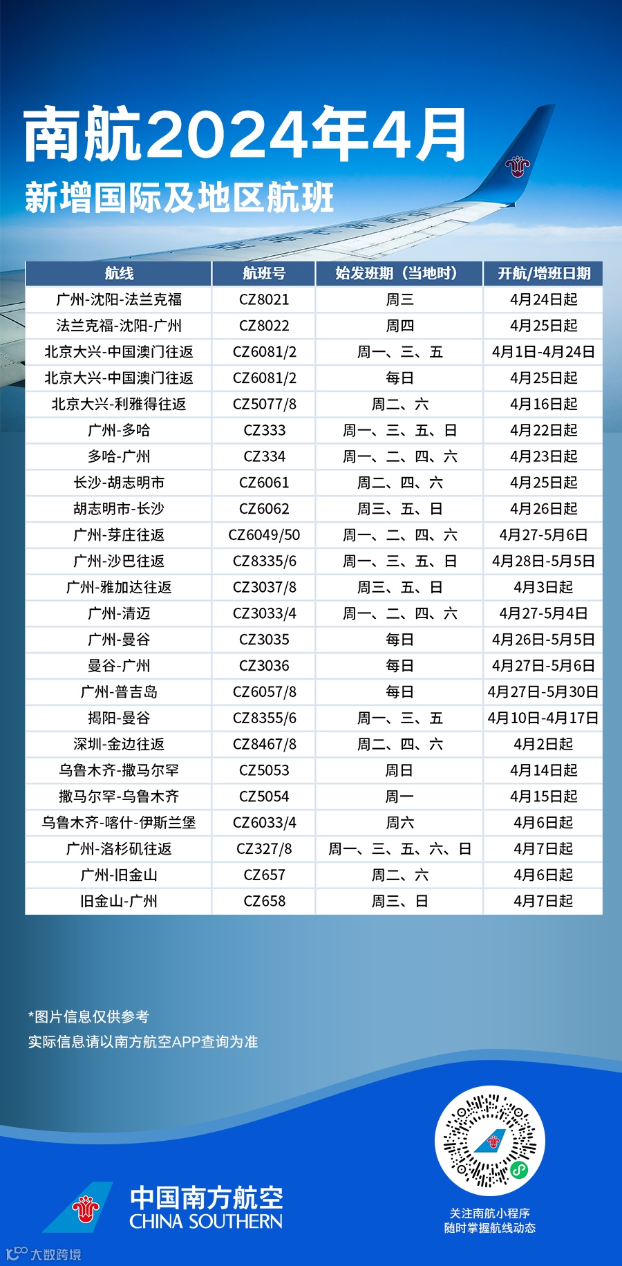 2024 年 4 月起,南航新增多个国际及地区航班: