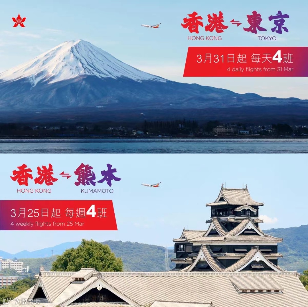 3 月 31 日起,香港航空香港✈东京的航班加至每天 4 班;3 月 25 日起,香港✈熊本的航班加至每周 4 班。