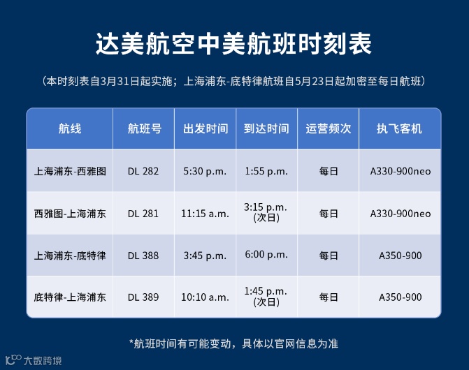 2024 年 5 月 23 日起,达美航空将增加上海浦东(PVG)✈底特律(DTW)之间的直飞航班由现在执行的每周 3 班加密至每日 1 班。