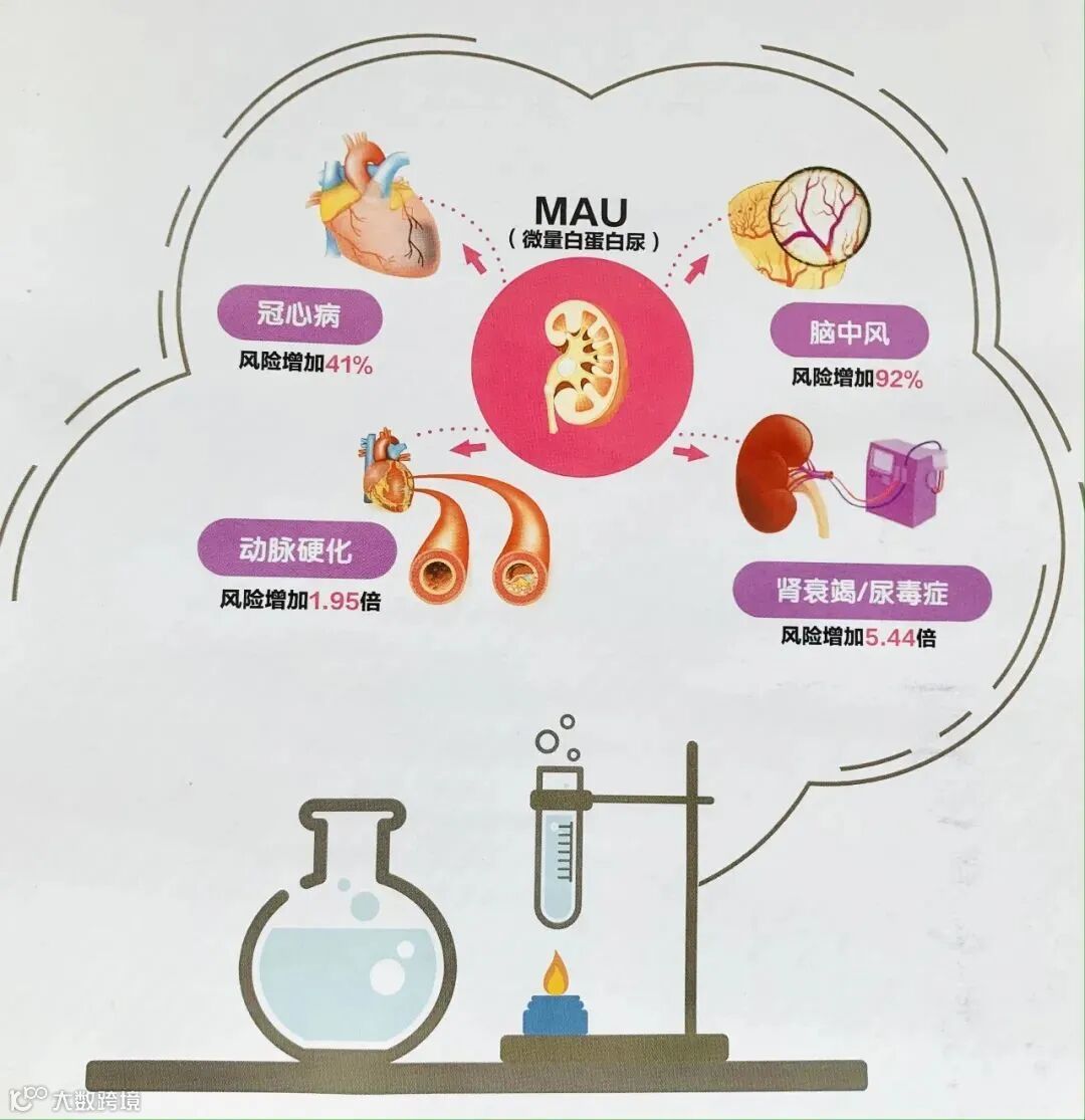 疾病时,肾小球基膜受到损害致使通透性发生改变,任何能够引起肾小球基膜通透性增高的病变,均可导致白蛋白的排出。因此微量白蛋白尿可以反映出人体肾脏异常渗漏蛋白质。