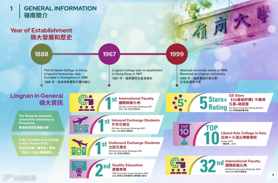 岭南大学简称 “岭大”,诞生于 1888 年的广州,奉行博雅教育理念,是亚洲博雅大学联盟创始成员,世界博雅院校联盟成员。岭南大学专注于人文社会科学的学术研究,会计学、社会学及人类学、社会工作学及社会政策和哲学的研究更为全港之冠及第二。