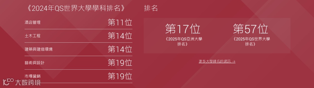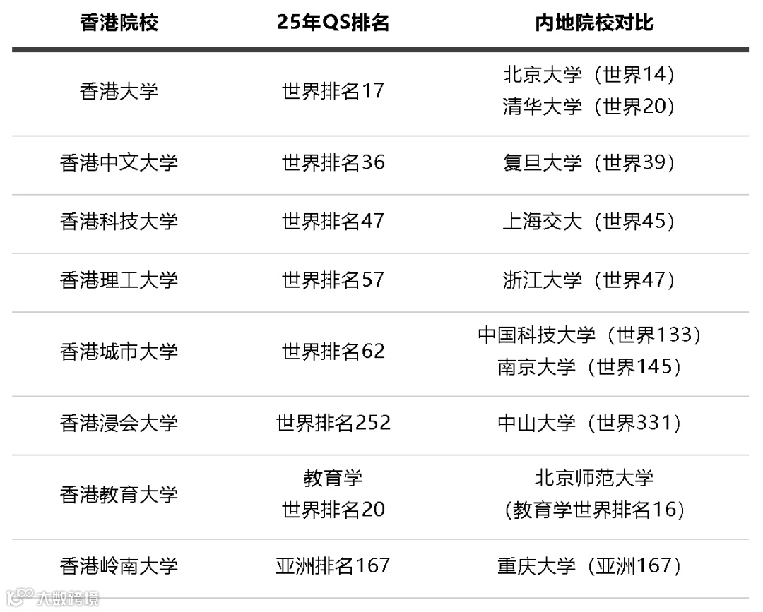 在最新的 2025 QS 世界大学排名中,港八大中有五所入选 QS 世界前 100。以下是港八大与内地院系的排名对比: