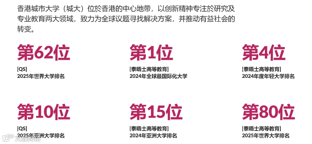 香港城市大学(City University of Hong Kong),简称 “城大 CityU”,是一所公立研究型综合大学。城大推行 “重探索求创新课程”,让学生有机会参与原创性科研工作,激励学生求知热忱,并培养其创新能力;必需修读的 “精进教育科目” 为学生补充主修科目以外的基本知识,拓宽视野、启发思维;主修科目中加入 “跨学科” 元素,使学生涉足各知识领域,全面发展。