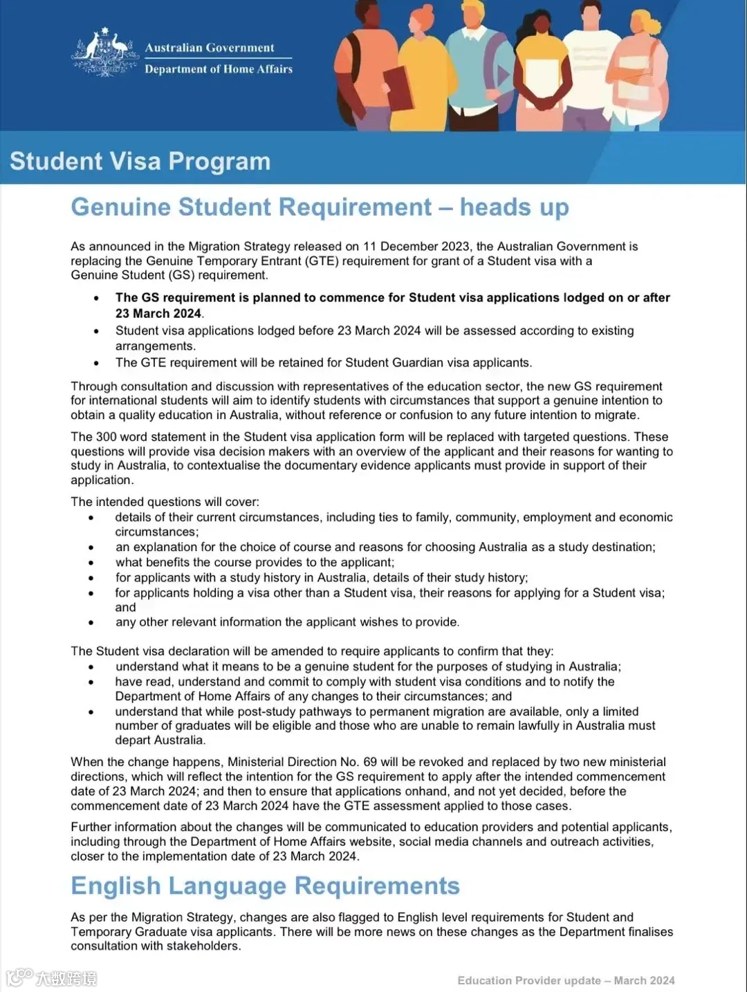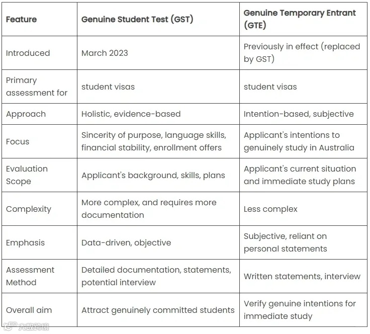 本次调整主要为将原有的GTE(Genuine Temporary Entrant Requirement,即真实的临时入境意图)更改为GST(Genuine Student Test,即真实的留学生要求)。