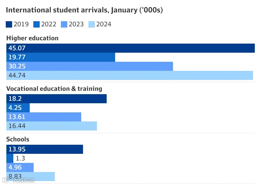 在截至去年12月的6个月里,只有80%的申请者成功获得签证,其中职业教育和培训机构受到的打击最大。澳洲学生签证持有者的数量从9月份的66.4万人下降到 12月份的54.7万人。