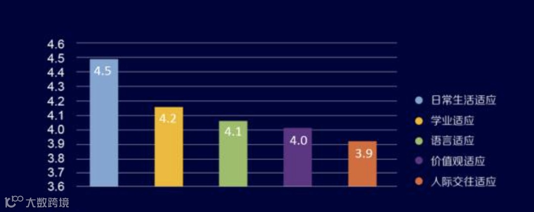 根据《中国留学生跨文化适应调查报告》显示,有63%的中国留学生社会文化适应处于“有一点困难”或“没有困难”水平,有4%的中国留学生社会文化适应处于“比较困难”或“非常困难”水平,即极端不适应和非常适应的人数较少,比较适应的人群比例较多。在适应社会生活的各方面中,日常生活成为中国留学生得分最高的选项,最低的是在人际交往方面。