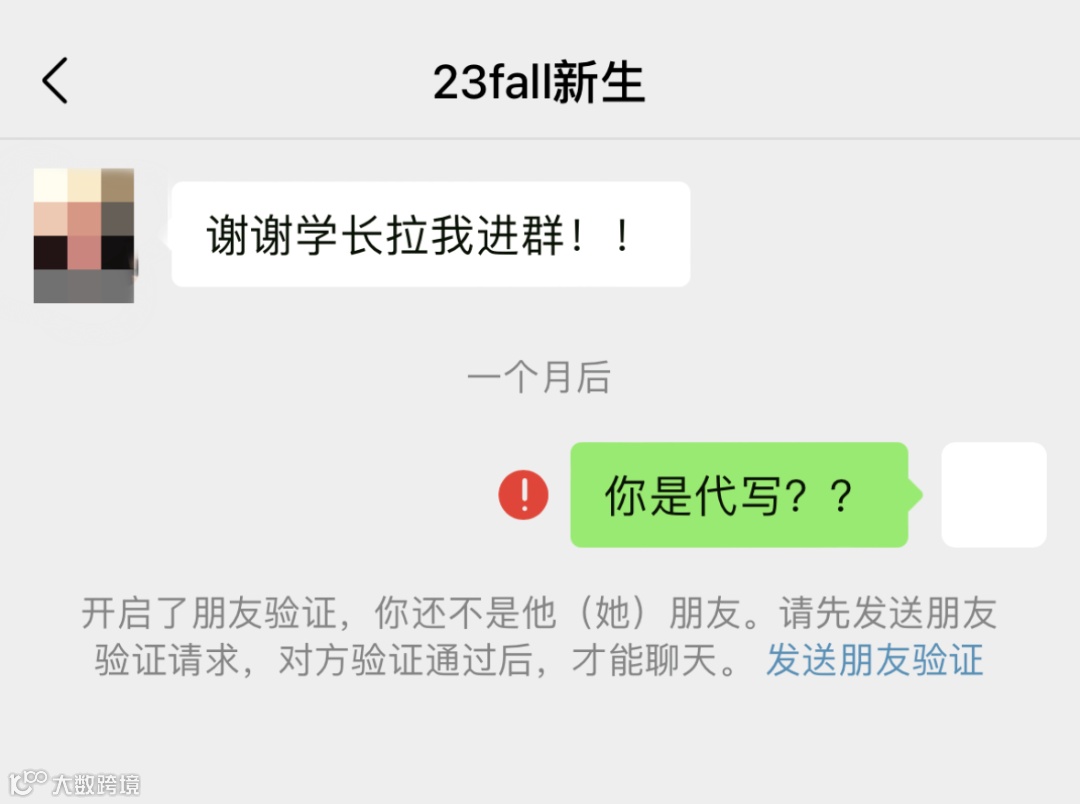 可能一开始他们潜伏的很好,虚心请教关于学校入学的问题,或者是热络地和“学长学姐”们拉起家常。可一旦有同学被蒙蔽,就像在群里埋下了一颗不定时炸弹,不知道将来的哪一天,TA就会在群里发送一大堆花里胡哨的代写广告。你生气地去质问,很有可能除了一个红色的感叹号什么也没剩下。