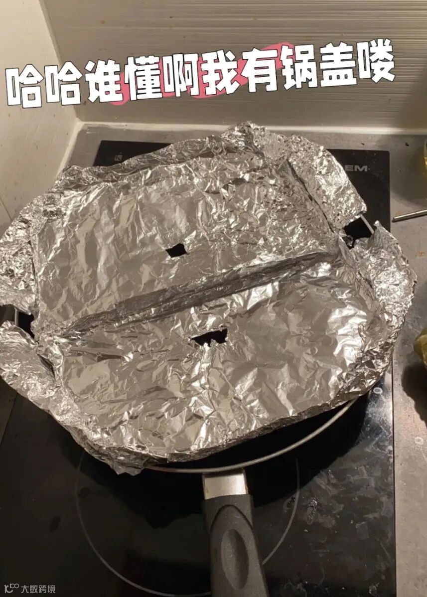 美国厨具锅和盖分开卖?卖的还不便宜?这可是为难了咱们中华美食烹饪步骤中一众集大成的环节:焖煮,炖,锁住水分等。无所谓,心灵手巧的留学生会出手!用锡纸捏成的锅盖保温效果一流不说,还可以随时改变出水孔这种设计甚至比真正的锅盖还要智能。