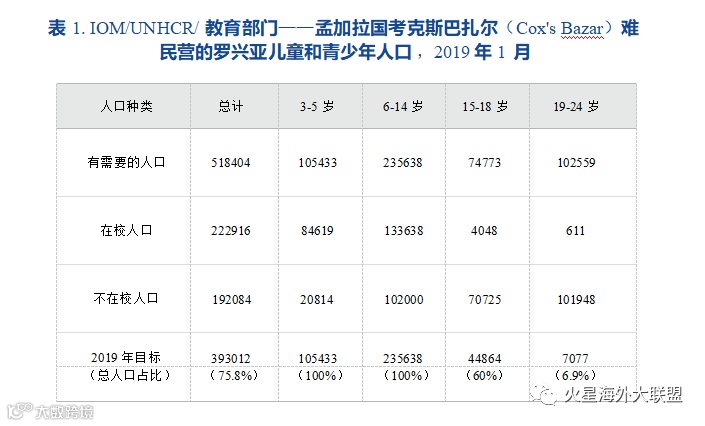 有关脆弱人群(例如流离失所的移民儿童)的数据, 一旦是具体的,且有可能对当前政策挑战 做出贡献时, 会变得尤其重要。 一个例子是下文有关在孟加拉国考克斯巴扎尔(Cox's Bazar)的罗兴 亚年轻难民分布的详细信息, 该地有超过 50% 的儿童人口失学。在这种情况下, 最新的年龄和性别 详细信息可以帮助适量地扩展学校课程和技能培训。