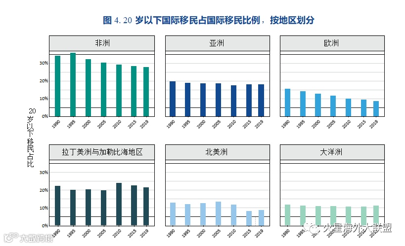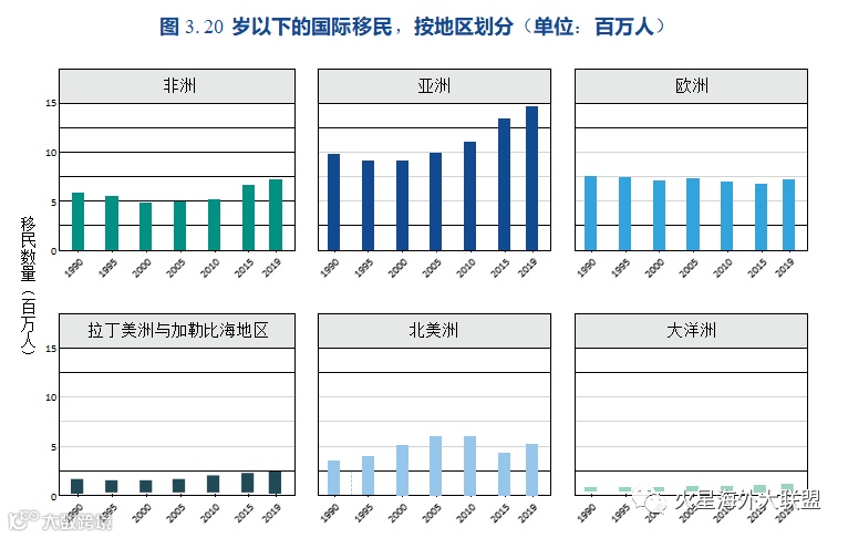 这些地区存量数据图补充了之前在图 1 和图 2 中显示的全球数据图。它们显示,一些地区(最 显著的地区是亚洲)经历了年轻移民数量的急剧增加。它们还着重指出了不同地区间儿童在其移民 存量中所占比例的巨大差异——非洲的占比接近 30%,而欧洲和北美洲的占比则不到 10%。