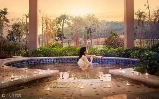 SPA客房内温泉大理石浴缸置于露天阳台上,在沐浴的同时可以观赏到风光秀美的湖泊及SPA岛!