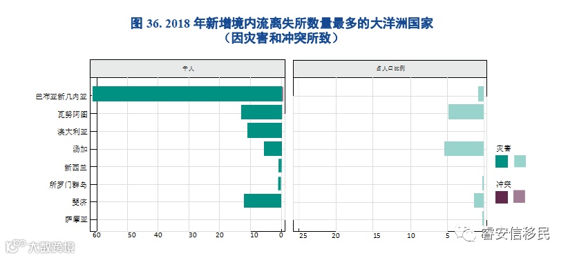 2018 年,大洋洲的大多数新增境内流离失所系因灾害而非冲突所致(见图 36)。巴布亚新几内 亚记录了最多的因灾害所致的境内流离失所(6.1 万),其中大多数由地震所引发。北马里亚纳群岛 (1.4 万)、瓦努阿图(1.3 万)和澳大利亚(1.1 万)也有其他与灾害相关的大规模流离失所记录。火山活动引发了瓦努阿图的大多数境内流离失所,而在澳大利亚,丛林火灾是造成其 2018 年大部分 流离失所的原因。巴布亚新几内亚是大洋洲唯一经历了因暴力与冲突而发生流离失所的国家,因冲 突导致的新增流离失所为 360 人次。
