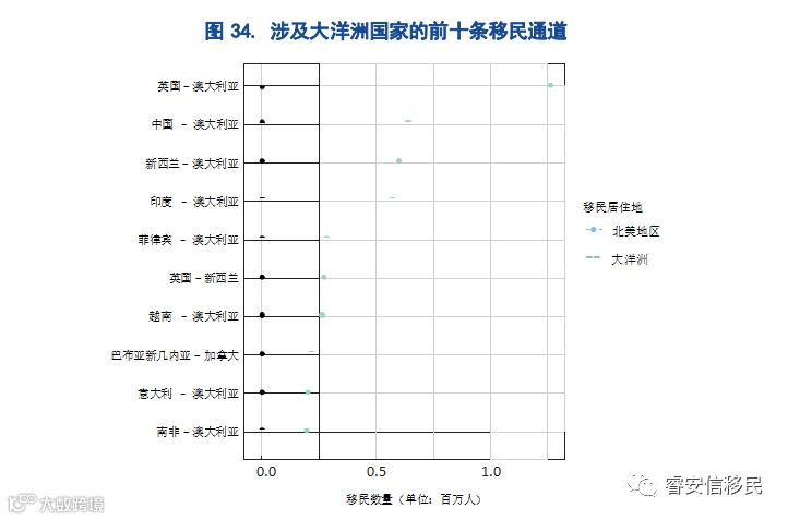 图34 呈现了涉及大洋洲国家的 10 条最主要的移民通道,这些移民通道体现了随时间迁移不断累 积的移民活动,并简单呈现了在特定目的地国迁移模式如何使外国出生人口成为该国人口的重要组 成部分。在该区域的 10 条主要移民通道中,8 条通道涉及前往澳大利亚的移民,其中最大的通道由 来自英国的移民组成。这些大型移民通道包括了来自大洋洲以外多个国家的移民, 包括中国、印度、 越南和菲律宾;许多移民来源国在过去数十年间都经历了人口的快速增长。来自大洋洲的移民更有 可能在区域内移民而非迁移至别的区域。例如,新西兰的迁出移民比例较高,其中绝大多数居住在 澳大利亚。