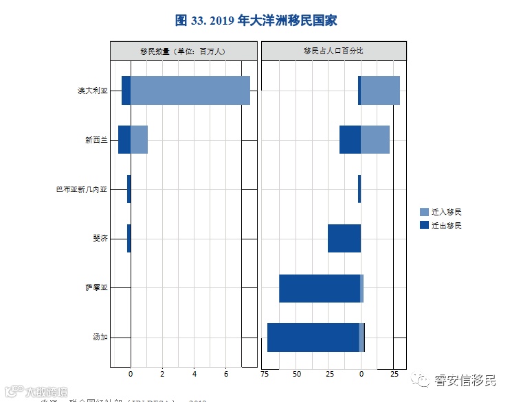 大洋洲的国际移民的绝大多生活在在澳大利亚和新西兰(见图 33)。该区域大多数国家的移民 情况都有明显的偏向,属于大型移民净输出国或移民净接收国。例如,汤加、萨摩亚和斐济的迁出 移民人数相较于其本土人口而言比例较高,而外国出生人口的比例很低。这些国家的迁出移民主要 生活在新西兰,另有小部分生活在澳大利亚。而澳大利亚和新西兰外国出生人口占总人口的比例均 较高, 分别达到 29% 和 22%。