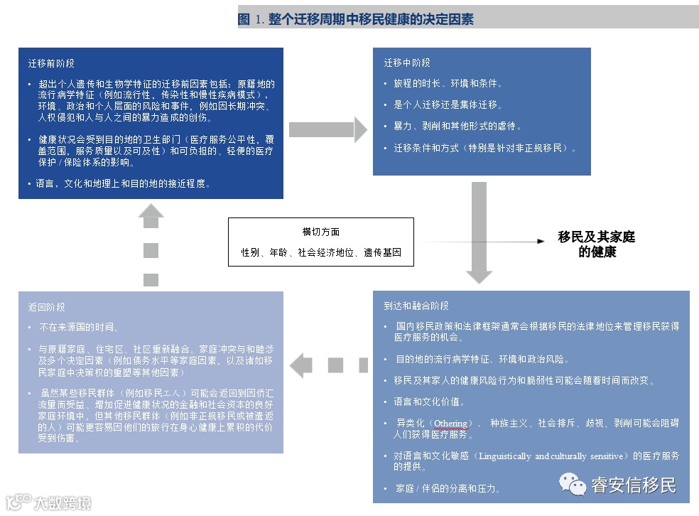 世界卫生组织(WHO)将良好的健康定义为“身体,精神以及对社会适应力全面健康的状态, 而不仅仅是没有疾病或者虚弱的状态。”3 在身体健康以外,这种对心理健康和社会适应力健康的认 识是至关重要的,并且它强调了从整体上看待健康的重要性。一个人的健康状况不仅取决于其能否 获得医疗服务,还取决于多种因素,它们被称为“健康的决定因素”。图 1 显示了健康的决定因素 如何在整个迁移周期中适用于移民。个体决定因素指诸如年龄、性别和疾病的遗传易感性,以及在 给定背景下的流行病学特征和与之相关的疾病风险等因素。结构性决定因素通常被政治性调节(例 如法律框架和社会对移民的态度),并且这些因素可能导致一系列社会经济地位的不平等。对于移 民而言, 健康的结构性决定因素包括与迁移旅程中不同阶段(迁移前、迁移中、迁移后以及返回(对 部分人而言))相关的条件。