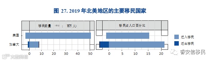 2019 年, 美国是世界上拥有最多外国出生人口的国家, 而加拿大的外国出生人口数量位居世界 第八位。北美地区的外国出生人口有超过 86% 住在美国。如图 27 所示, 2019 年, 加拿大总人口中 外国出生人口的比例(超过 21%)显著高于美国(15%)。和美国相比, 加拿大迁出移民的比例(占 国内总人口的百分比)也更高。