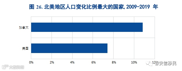 图 26 显示了 2009-2019 年间北美人口变化比例最大的国家。 加拿大和美国均出现了人口增长, 其中加拿大的人口规模在过去十年间扩张幅度较大(11%)。同一时期, 美国的人口规模同样扩张了 约 7%。在加拿大, 近期的人口变化主要是由迁入移民所驱动的, 而迁入移民也依然是加拿大人口增 长的主要驱动因素。