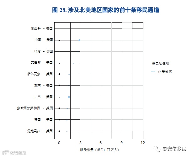 图28 呈现了涉及北美国家最主要的10 条移民通道,这些移民通道体现了随时间迁移不断累积的 移民活动,并简单呈现了在特定目的地国迁移模式如何使外国出生人口成为该国人口的重要组成部 分。北美地区最大的移民通道涉及从亚洲或从拉丁美洲和加勒比海地区去往美国的移民。出生于墨 西哥的移民构成最大的移民群体, 2019 年该群体有超过 1100 万人生活在美国。第二大移民通道涉及 人口众多的亚洲国家,包括中国、印度和菲律宾。其他较大的移民通道,例如从越南、韩国和古巴 前往美国的通道在这些国家多年前的冲突和政治变革后也迅速壮大。