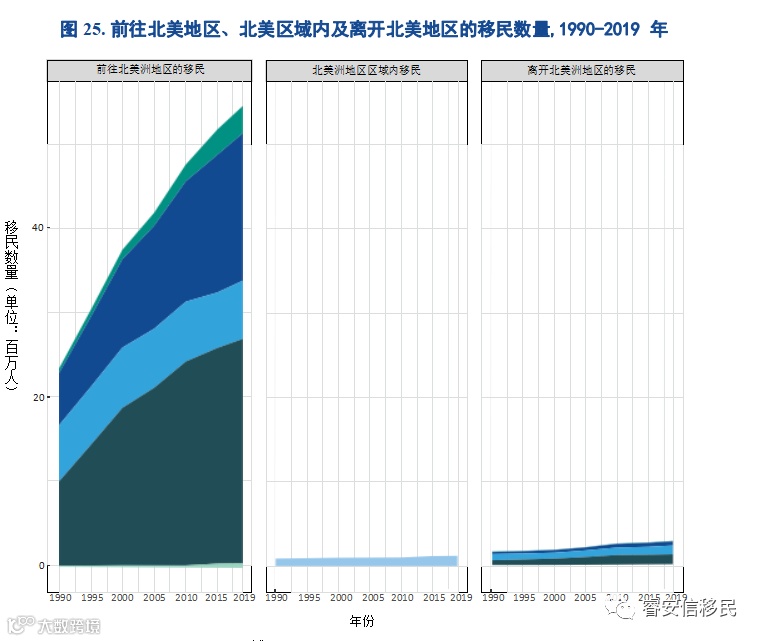 和这一区域来自其他地区的移民数量相比, 北美地区的区域内移民和前往其他地区的移民数量 相对较少。与亚洲和非洲等以区域内移民为主的地区形成对照, 2019 年, 出生于北美地区但迁往其 他地区的移民(约 300 万人)多于在该区域内部进行迁移的移民(约 140 万人)。