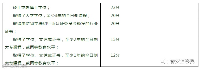 主申请人的教育程度得分是根据完成教育和受训的材料文件评定的。主申请人必须提供包括学位证书、学历证书、或教育受训相关学历证书。最高23分。