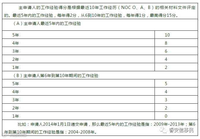 主申请人的工作经验得分是根据最近10年工作经历(NOC O、A、B)的相关材料文件评定的。申请人必须出示至少一年或相等的和在加拿大将从事职业相同的工作经验,才能申请该项目。材料文件必须包括主管或人力部工作人员提供的公司专用信笺纸打印的推荐信一封、申请人的正式工作薄或其它正式官方文件。推荐信必须陈述申请人的工作职称、工作职责、薪酬和工作期限。最高15分。