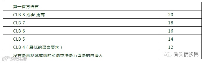 主申请人的语言能力分数是根据申请人提供的英语或法语培训证明及能力计算的。如果你既有英语语言能力,也有法语语言能力,你需要决定你对哪种语言更熟练。熟练的为你的第一官方语言,另外一种就是你的第二官方语言。申请人必须提交最近的被SINP认可的语言测试成绩作为你语言能力的判断依据。“CLB”是指加拿大语言基准。最高20分。