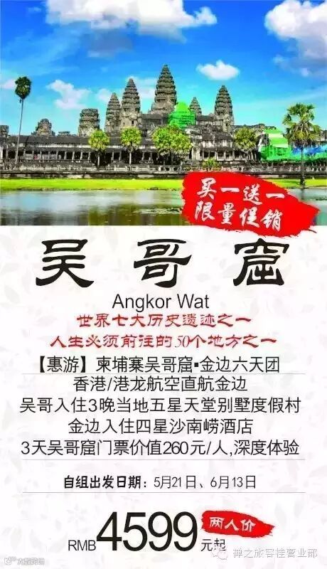 5月21日出发【特惠游】柬埔寨吴哥窟•金边六天团两人同行价4599元起(另可预定6月13日团出发)