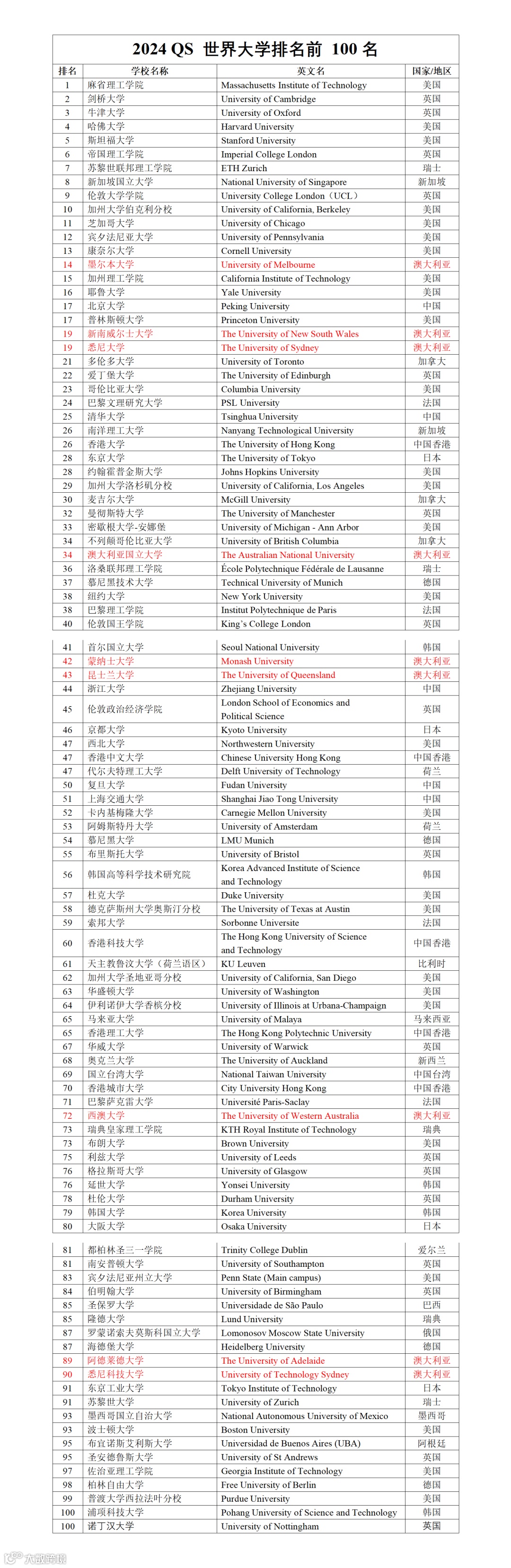 下表是详细的2024年QS全球大学排名TOP 100,其中澳大利亚共九所高校上榜,这也是最热门的九所院校,分别为: