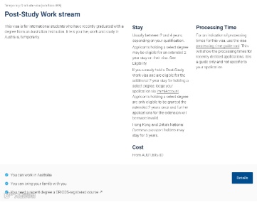同时,因为澳大利亚是一个移民国家,所以相比于其他发达国家,其移民政策的制定也更为友好。比如其工签Post-Higher Education Work Stream 允许高校毕业生在毕业后留在澳大利亚继续工作,以下时具体政策: