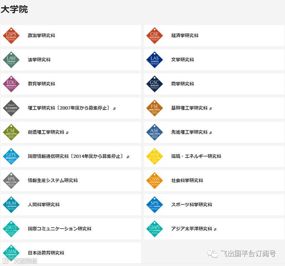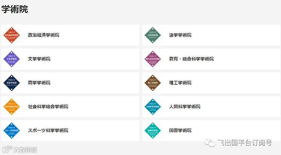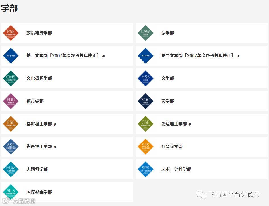 大学本科包括政治经济学、文学、文学构想教育、法学、商学、社会科学、教育学、基干理工、创造理工、先进理工、人类科学、运动科学、国际教养等13个学部。