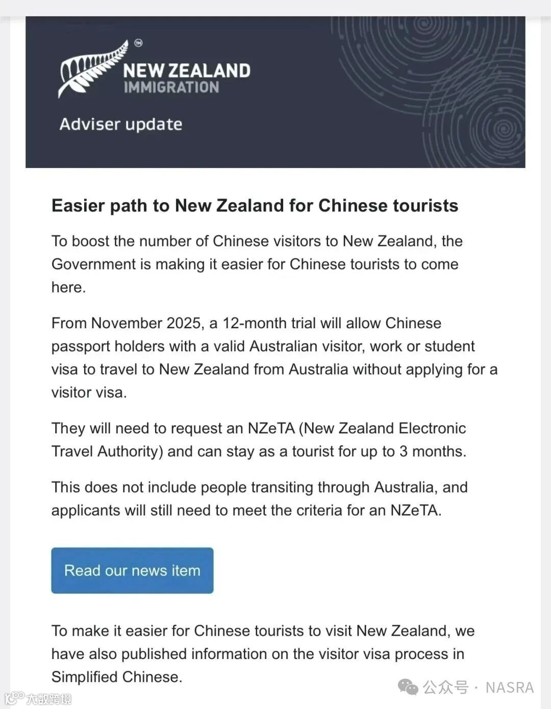 为了吸引中国游客去新西兰旅游,从2025年11月起,持澳大利亚签证从澳大利亚去新西兰的中国游客,入境新西兰可以免签。