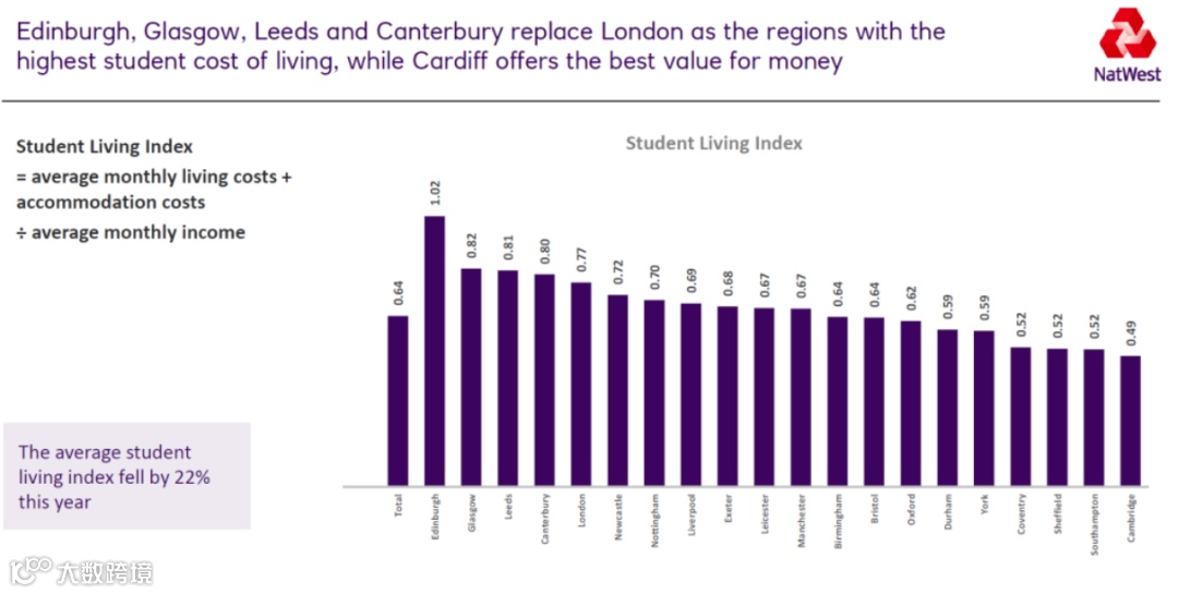 (爱丁堡取代伦敦成为2022年学生生活指数最高的城市,因为这里的学生月平均收入较低。学生生活指数=(学生月平均生活费+住宿费)/平均月收入)