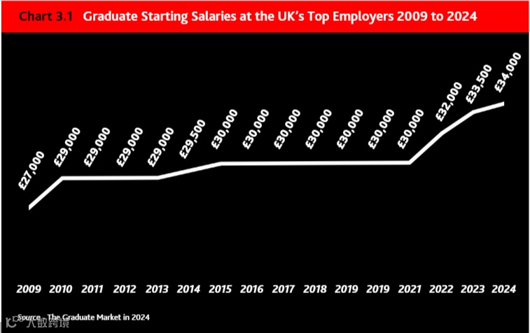 报告指出,在英国TOP雇主给出的薪资中,2024年毕业生起薪中位数有所上升,自2021年以来薪资增长了13.3%,至34000英镑。但本报告似乎没有考虑2009年-2024年的通货膨胀对货币购买力的影响。