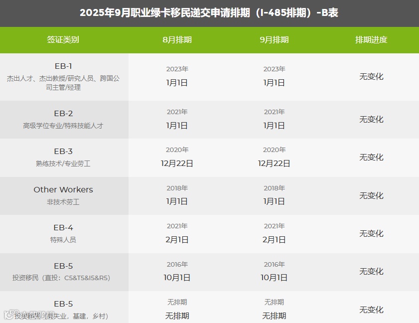 EB-5(非保留类别 Unreserved):维持在 2015年12月8日,新法投资移民继续无排期