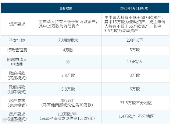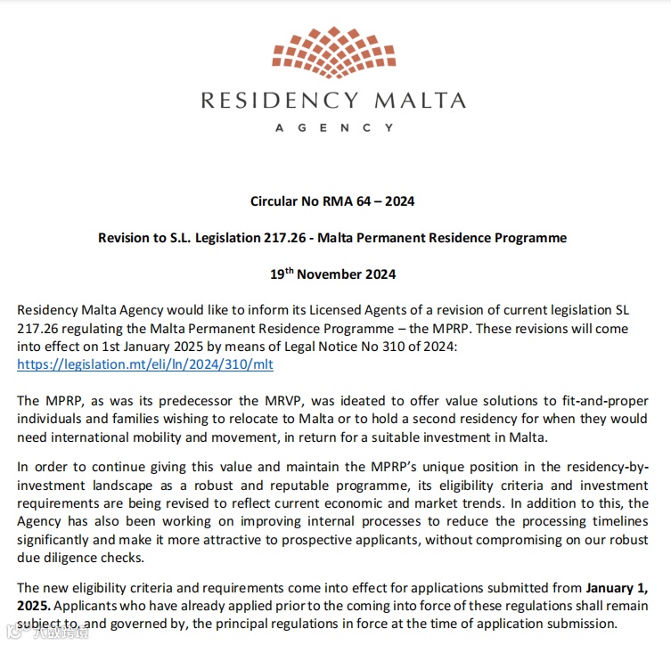 狄邦海外投资2024年11月19日,马耳他身份局官方发布通告,宣布对马耳他永久居留计划(MPRP)法案进行修订,新修订案将于2025年1月1日正式生效。此次修订案对项目的管理费用、房产标准以及捐款金额等多个方面均提高了门槛。