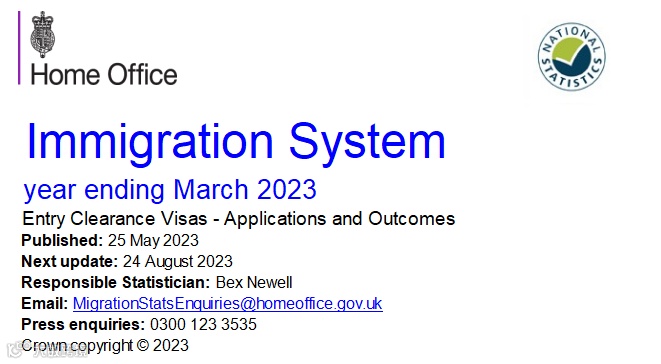 当地时间2023年5月25日,英国内政部发布了最新2023年第一季度的签证数据报告,下次的更新时间为2023年8月24日。