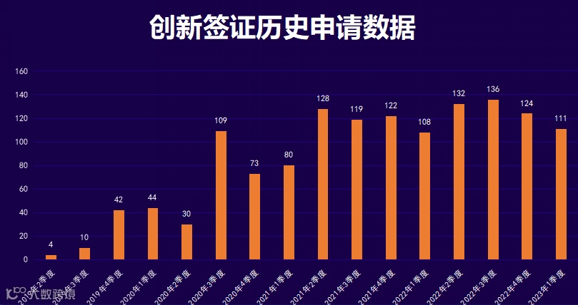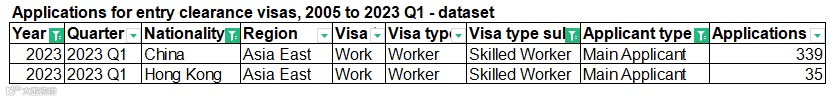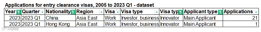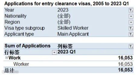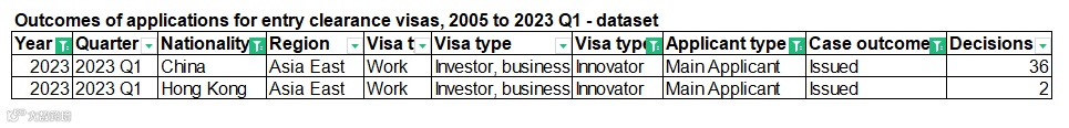 从以上数据可以看出,2023年第一季度,创新签证共计递交111人,中国大陆递交21人,获批36人,获批量创历史新高,同比2022年第一季度增长率为414%。工作签证2023年第一季度的申请量为16053人递交,中国大陆递交339人,获批346人。