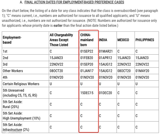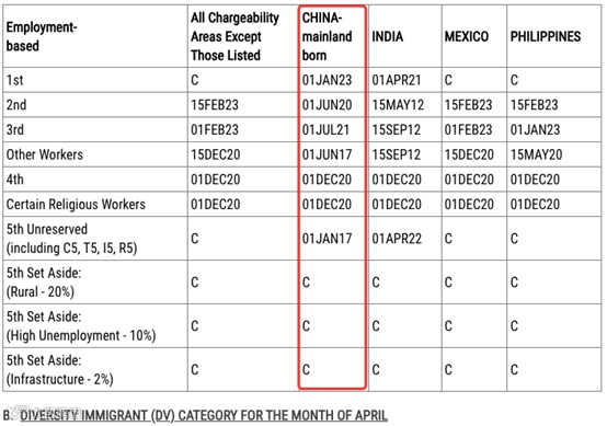 EB-1在上月前进14天后,在4月排期表中又前进了48天。表A排期来到2022年9月1日,表B继续停留在2023年1月1日。