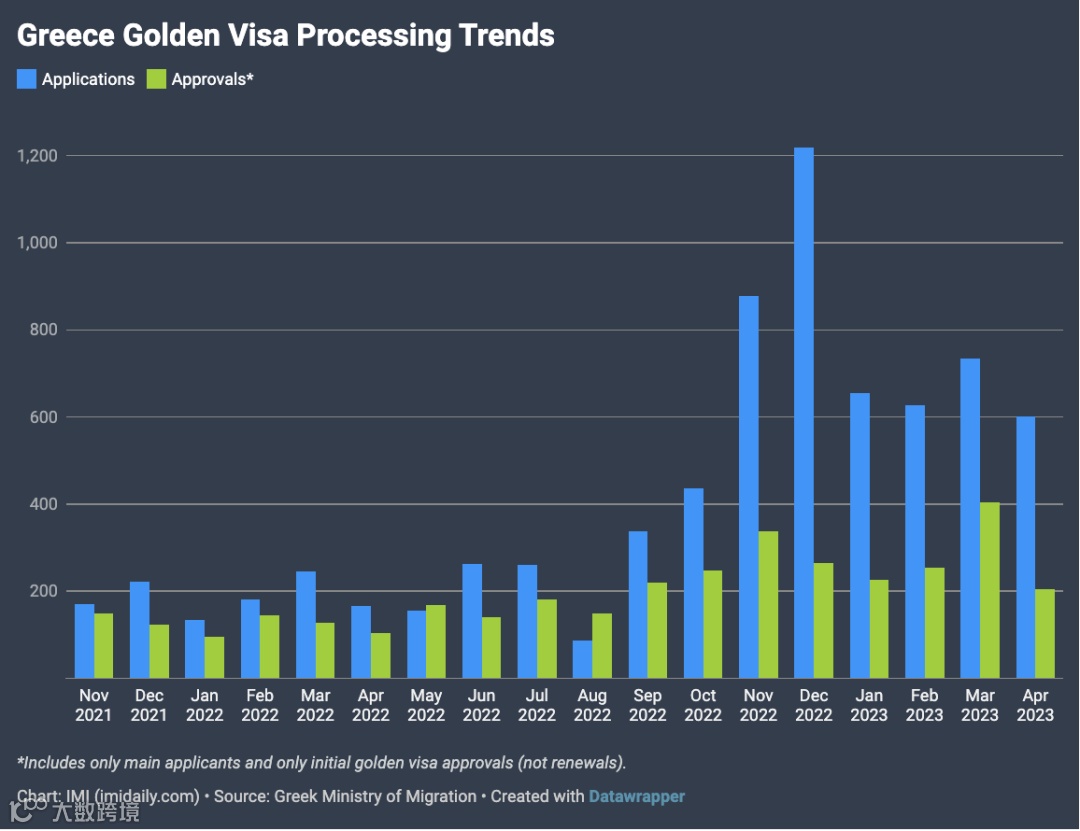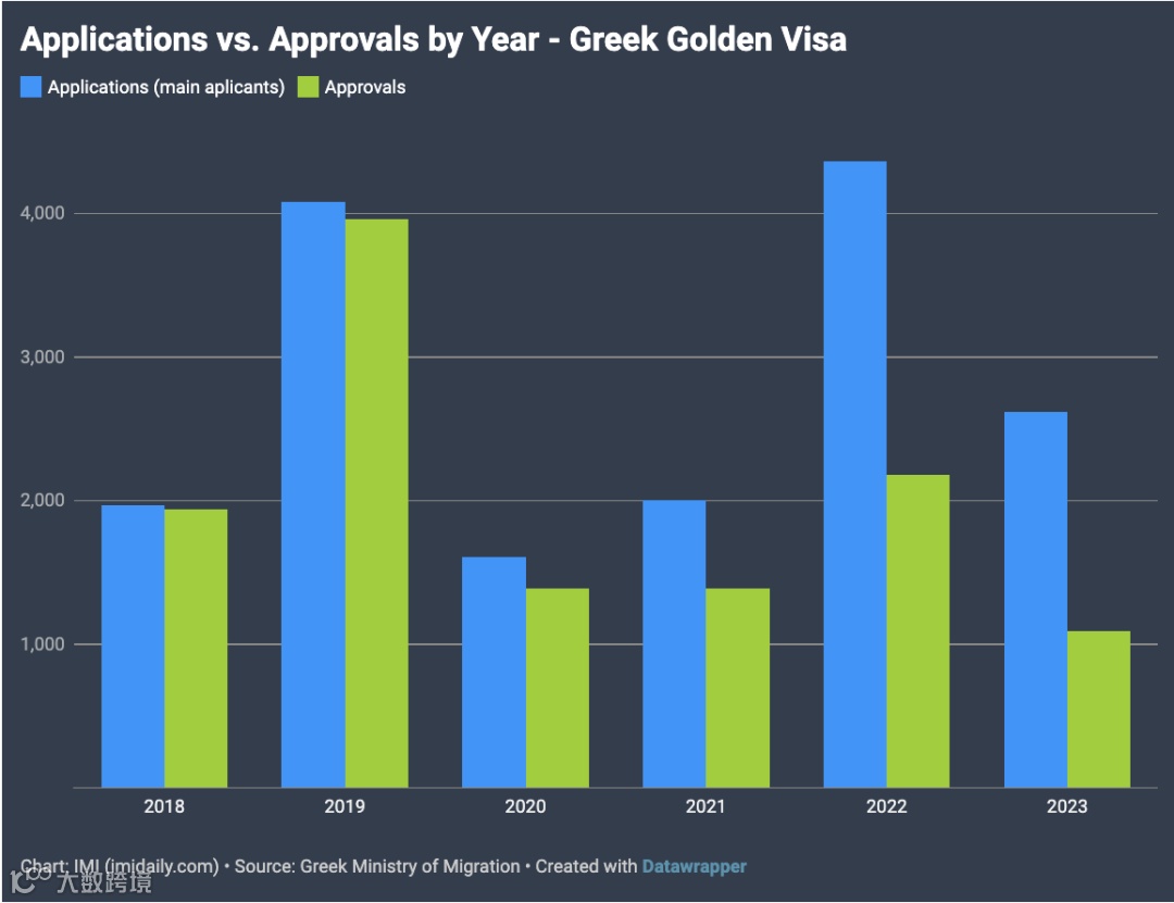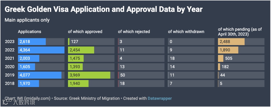 截止2023年前1/3时间结束,希腊已经接收到了2,618宗申请案(是去年总数的大约60%),这意味着2023年的申请量将会大幅超越之前各年度。截止5月1日,希腊仅批准1,090宗申请案,不太可能打破2019年3,963宗的记录。