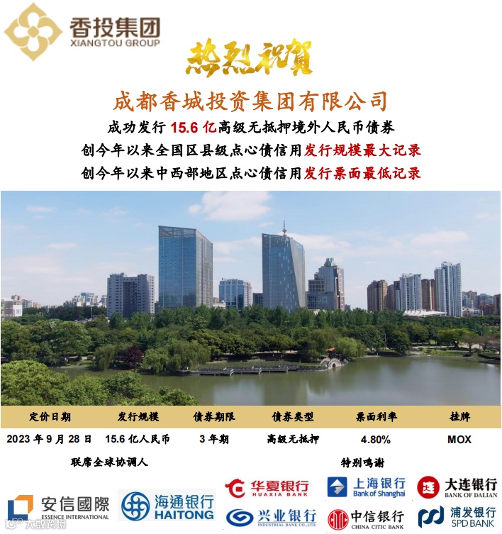 2023年10月13日,安信国际证券(香港)有限公司(证监会中央编号:AUW685)作为牵头全球协调人、联席簿记管理人及联席牵头经办人,成功协助成都香城投资集团有限公司(以下简称“公司”)发行15.6亿元点心债,属安信国际以全球协调人角色完成的单笔最大规模点心债。本笔债券期限为3年期,最终票面利率4.8%,债券于10月13日在澳交所挂牌。