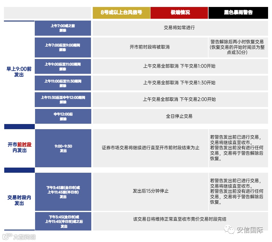 以下内容根据港交所官网发布的关于台风、极端情况及黑色暴雨期间的交易安排摘录整理而来。