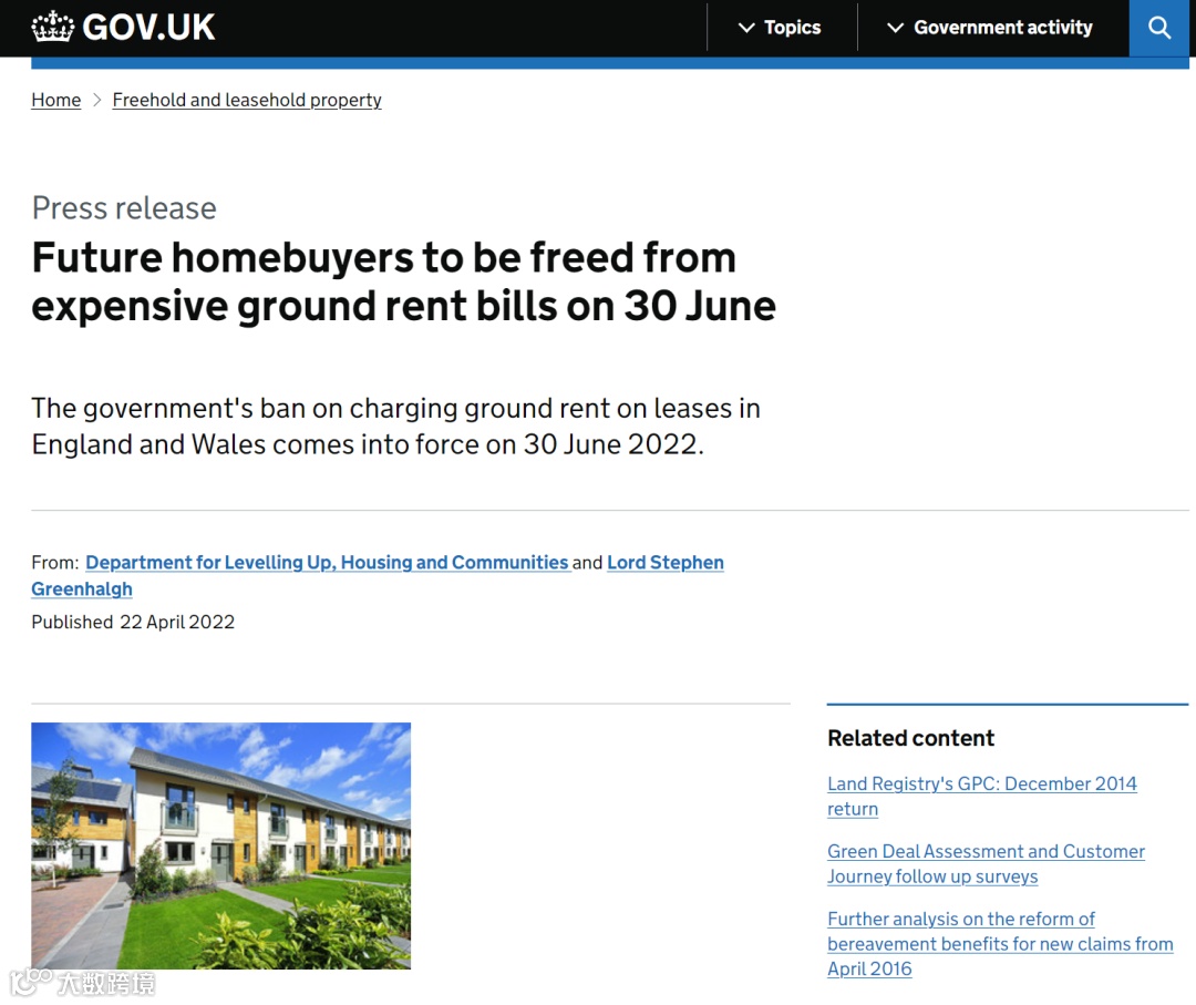 据英国政府官方网站报道,自2022年6月30日起,英格兰和威尔士将取消新租赁产权房的地租,买家购买租赁产权(Leasehold)的公寓或别墅将无需缴纳地租(Ground Rent)。