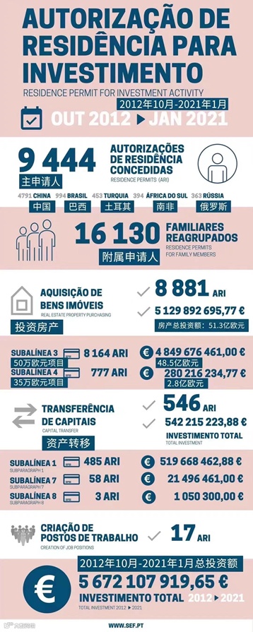 葡萄牙移民局也再次更新了2012年10月黄金居留政策推行以来的整体数据,数据显示,8年多来,已有9444位主申请人获批葡萄牙黄金签证,其中中国申请人为4791人,占比在一半以上,可见中国投资者对葡萄牙项目的喜爱和认可。通过黄金签证计划葡萄牙共吸纳了56.72亿欧元投资,其中51.3亿资金直接投资于房地产市场。